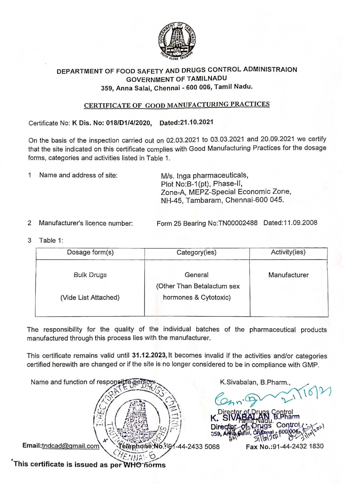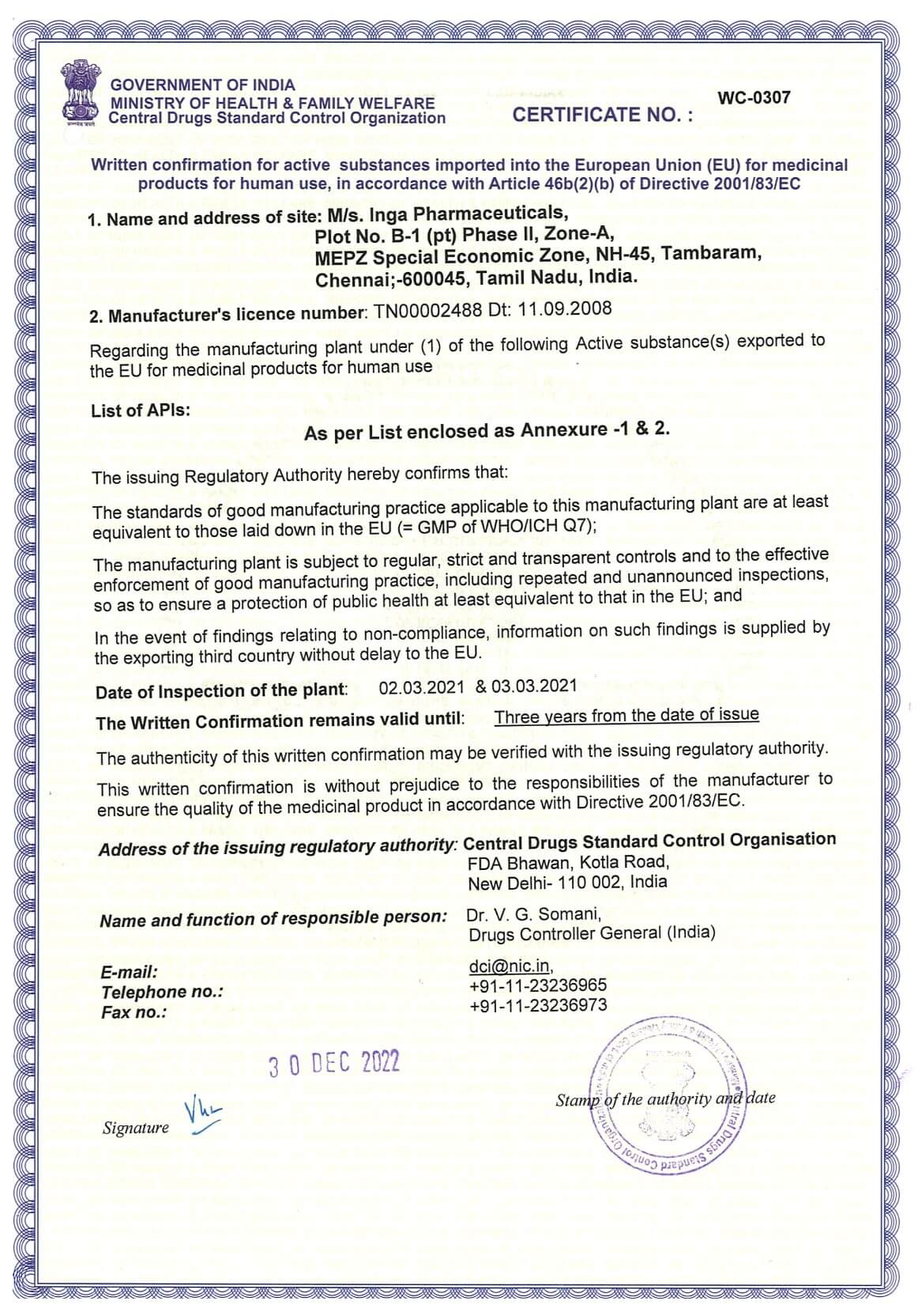The facility has been inspected by various regulatory authorities such as the US Food & Drug Administration (FDA), Central Drugs Standard Control Organisation (CDSCO), Office of the Director of Drugs Control, Tamil Nadu and various other multinational corporations.